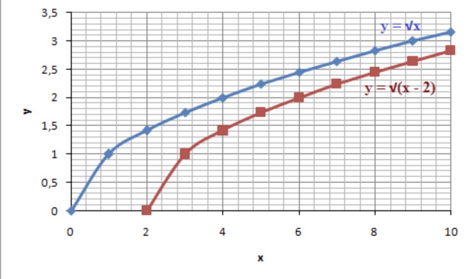 If you look at the graphs above which all have c = 0 you can see that they all have a range ≥ 0 (all of the graphs start at x=0 since there are no real solutions to the square root of a negative number). If you have a c ≠ 0 you'll have a radical function that starts in (0, c). An example of this can be seen in the graph to the left